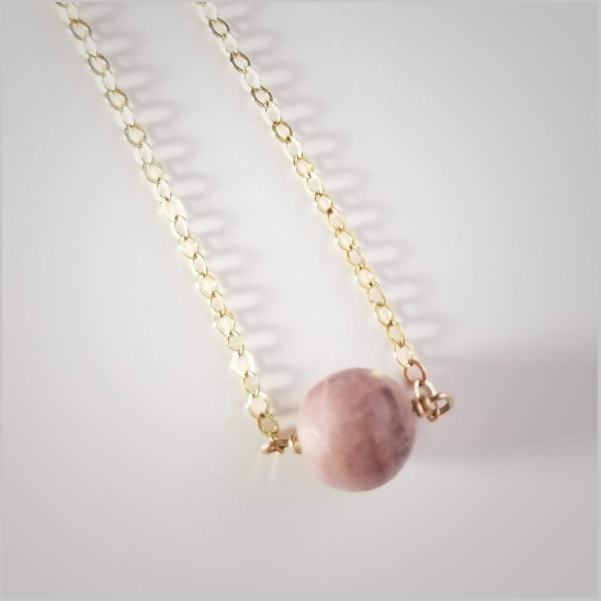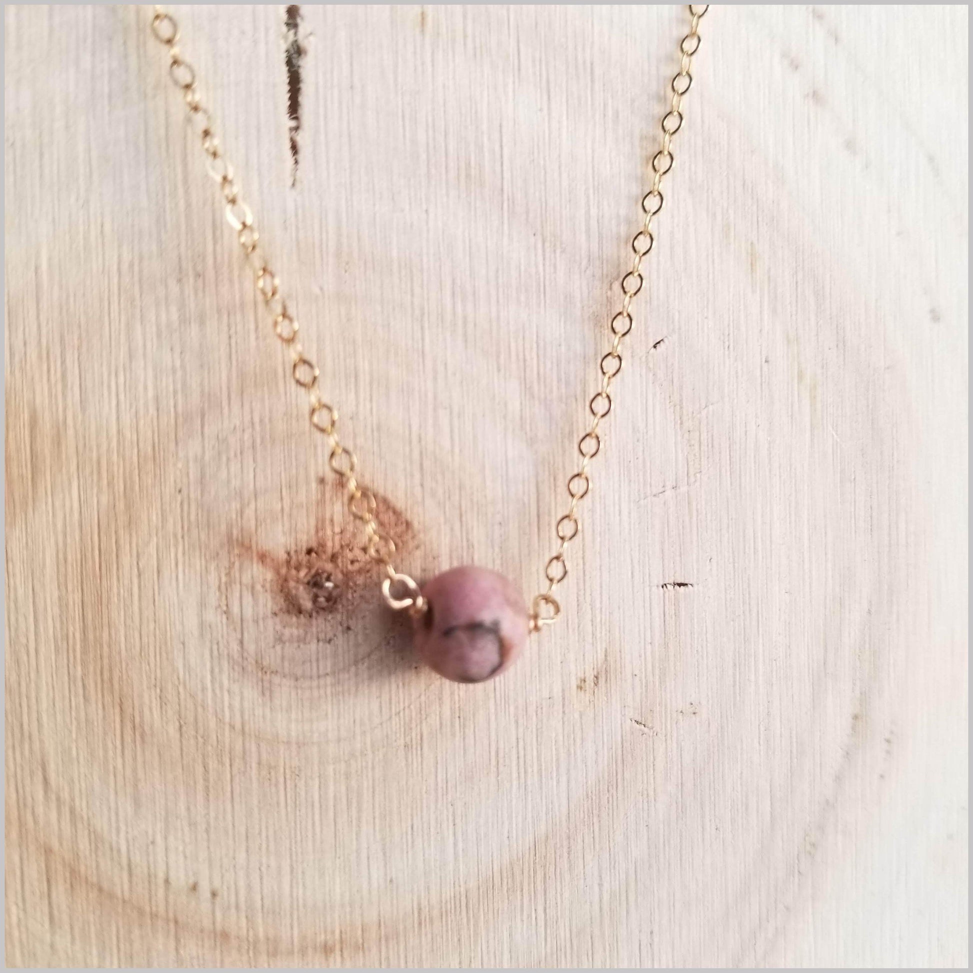 This beautiful and delicate necklace is handmade with natural Rhodonite.