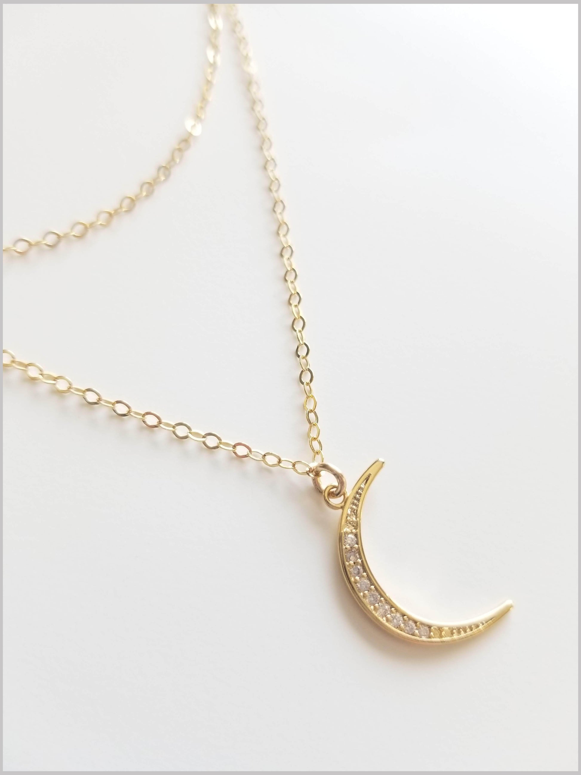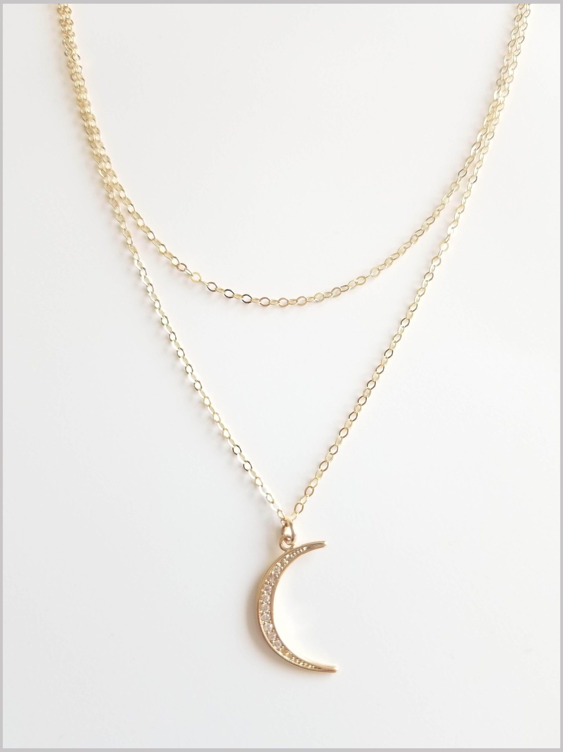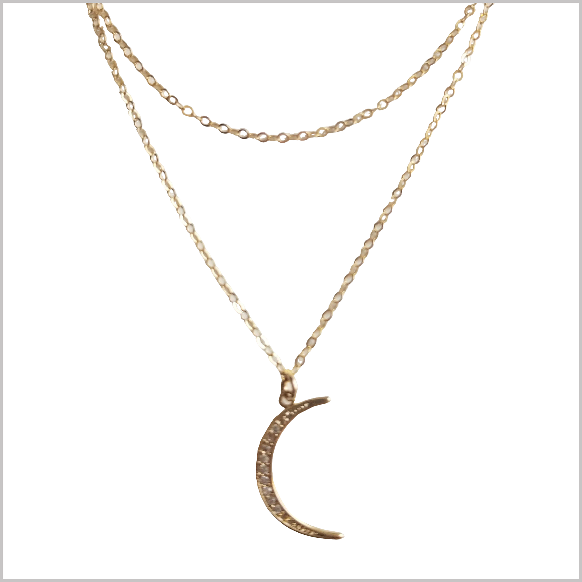 The Crescent moon signifies the change, the ebb and flow of life. An extremely feminine symbol this double Layer necklace features a beautiful glittered crescent made of 14K gold fill or sterling silver material.