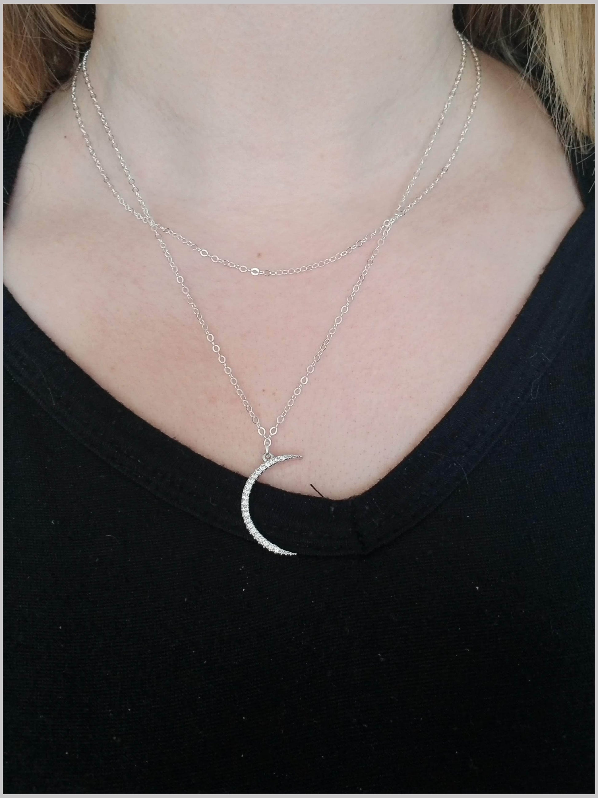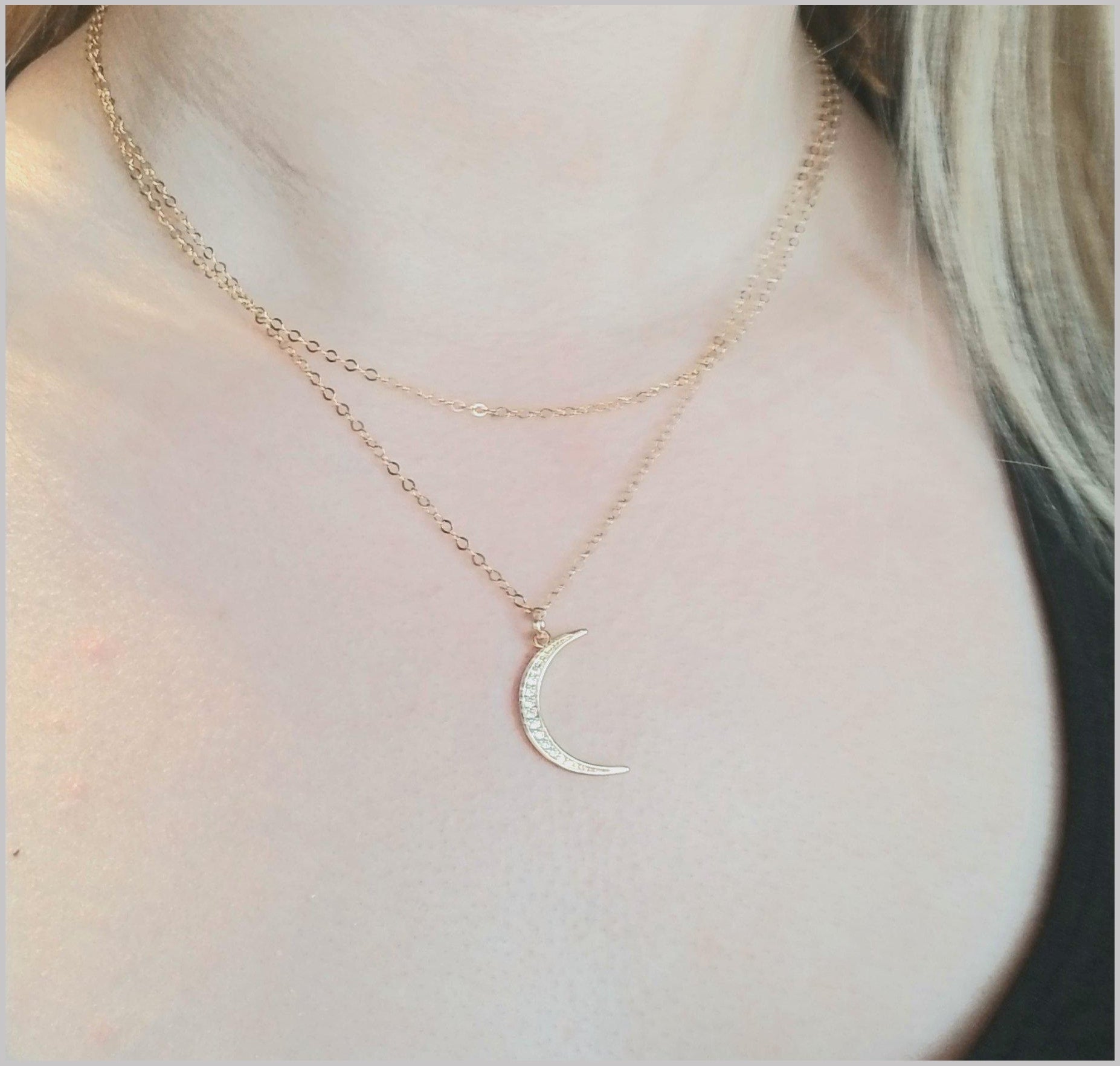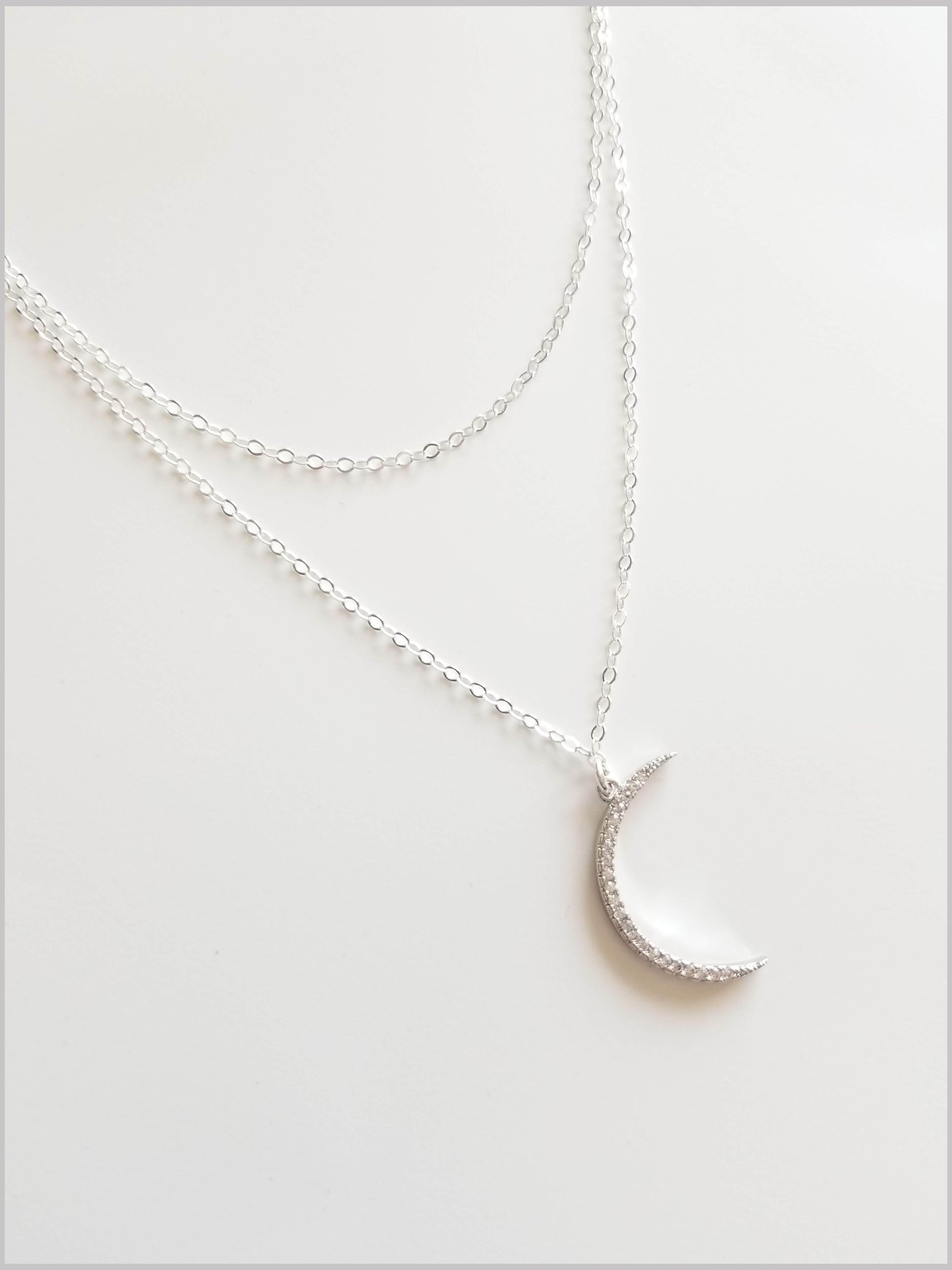 The Crescent moon signifies the change, the ebb and flow of life. An extremely feminine symbol this double Layer necklace features a beautiful glittered crescent made of 14K gold fill or sterling silver material.