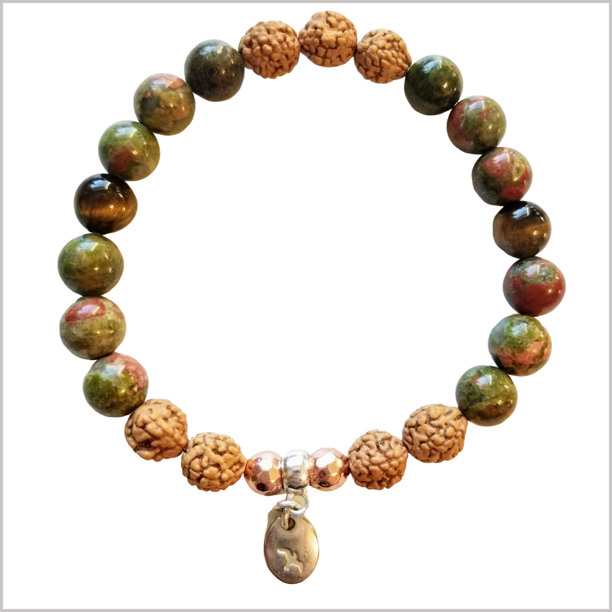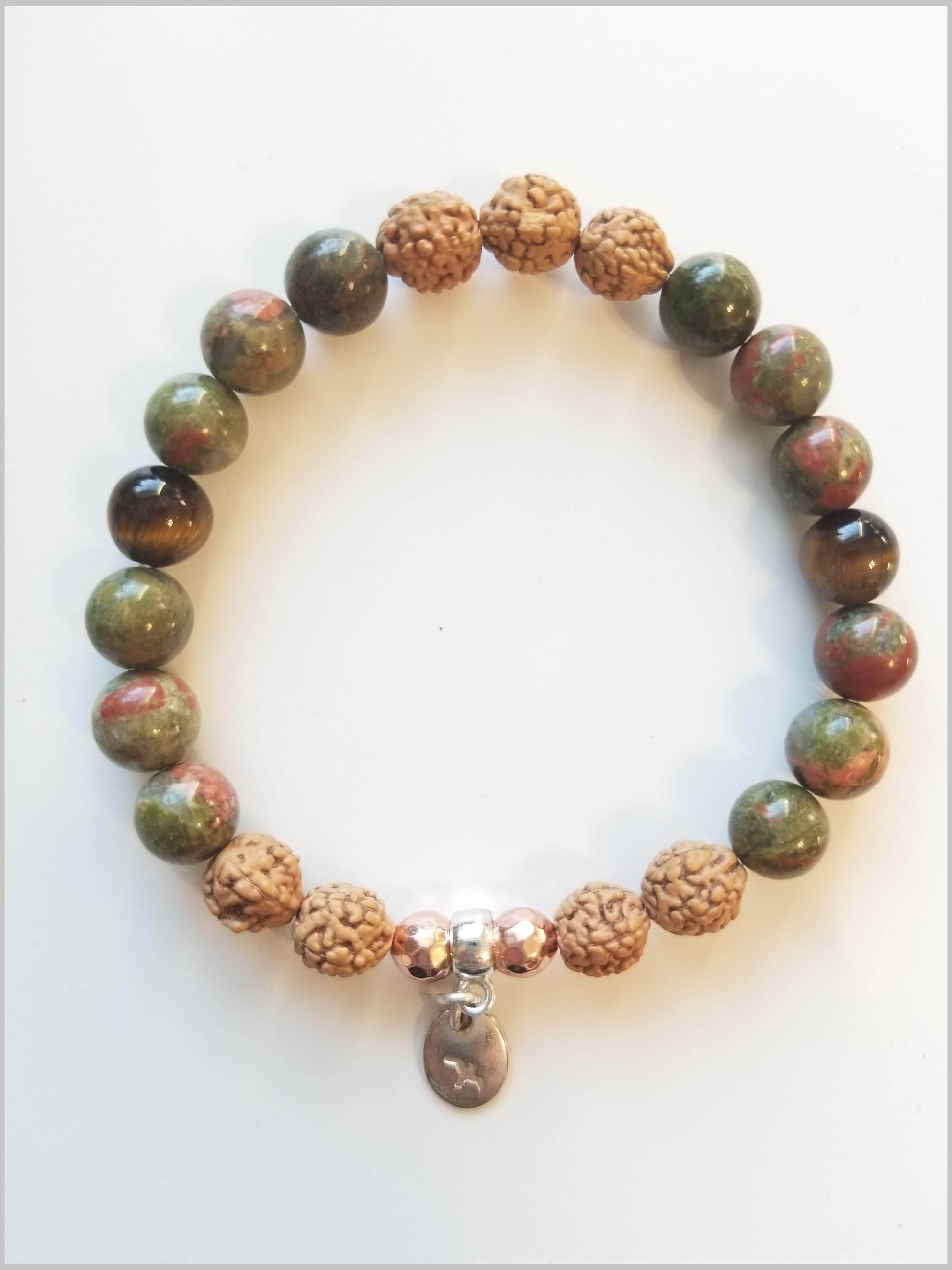 This beautiful Bracelet is handmade with natural Unakite, Tigers Eye and Rudraksha Beads.