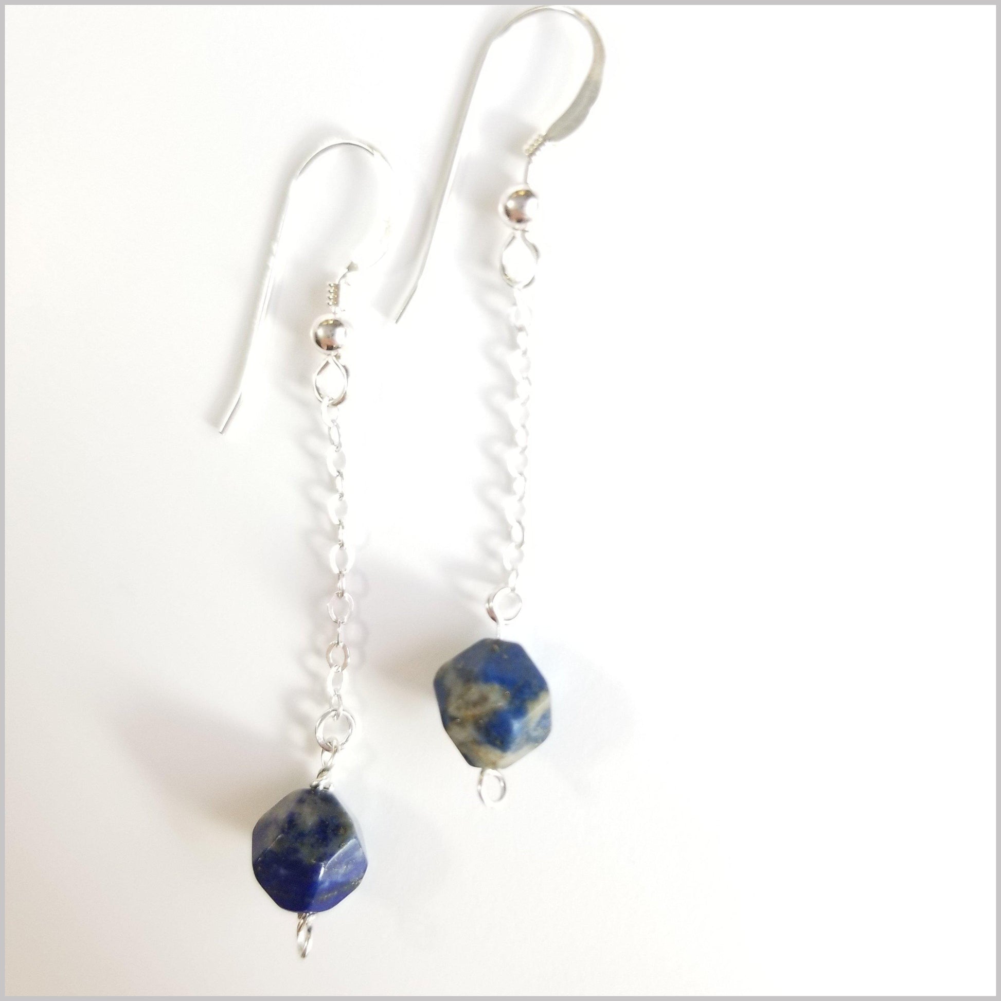 These alluring drop earrings are handmade with natural Lapis Lazuli.