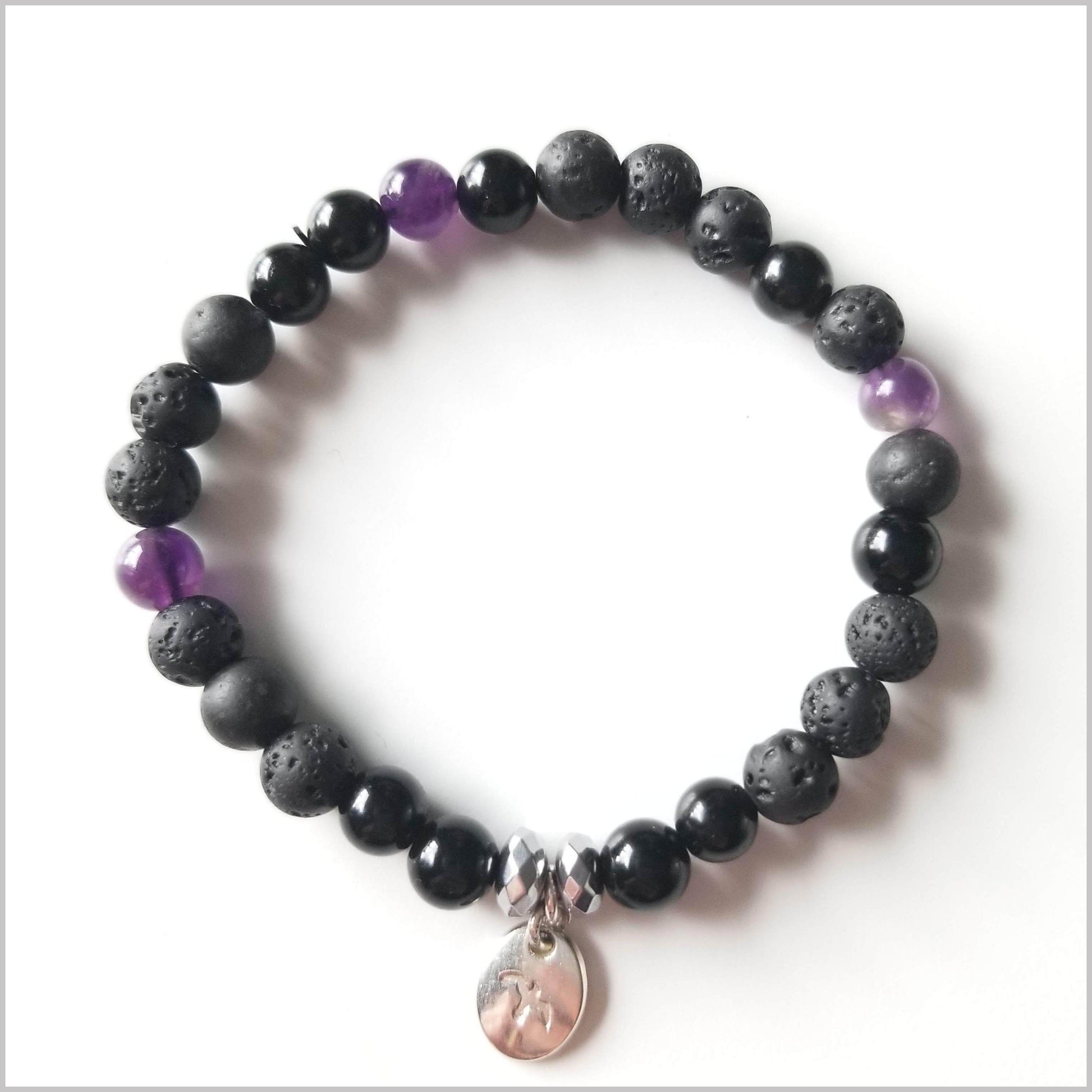 This beautiful Bracelet is handmade with Tourmaline, Amethyst and Lava beads.