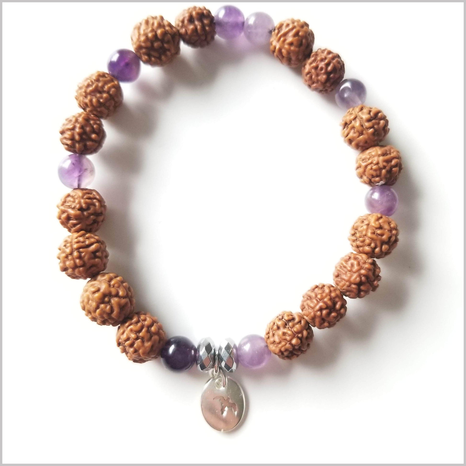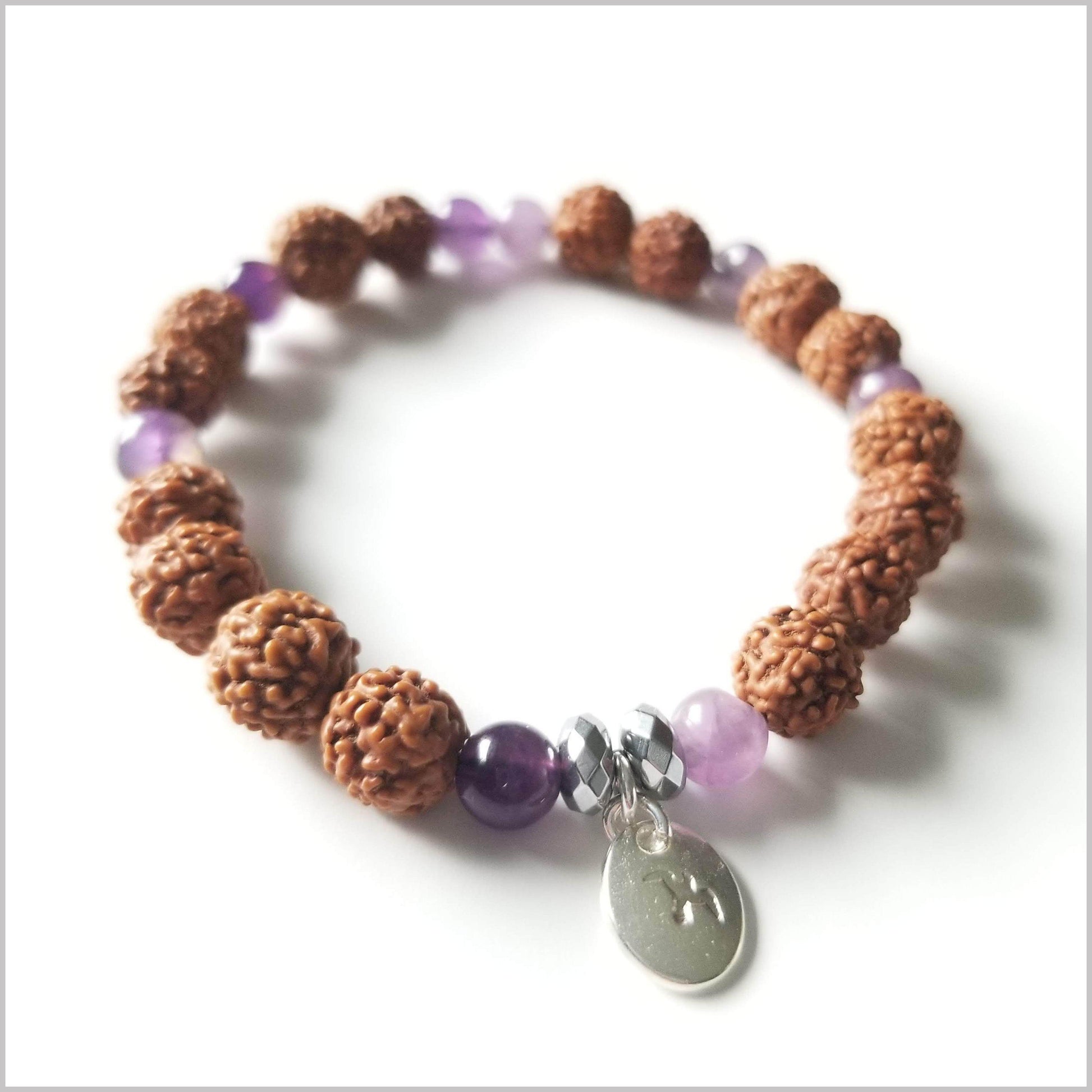 This beautiful Bracelet is handmade with natural Amethyst and Rudraksha Beads.