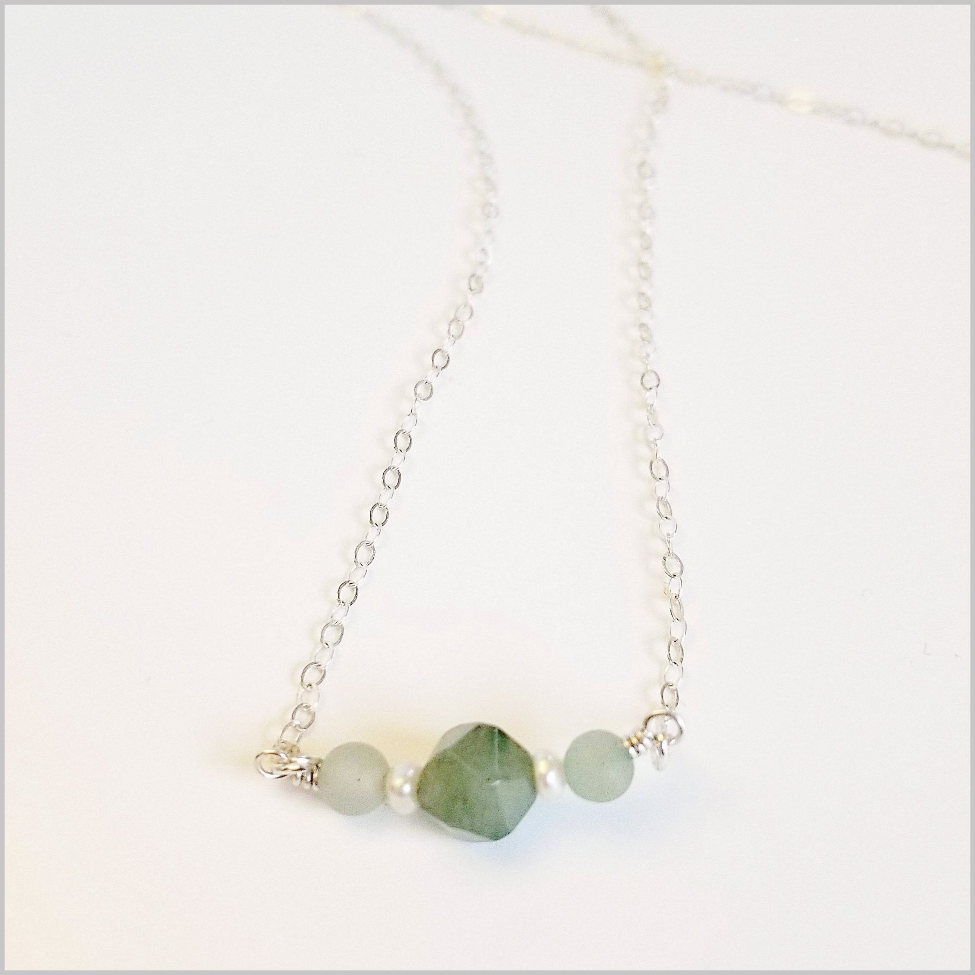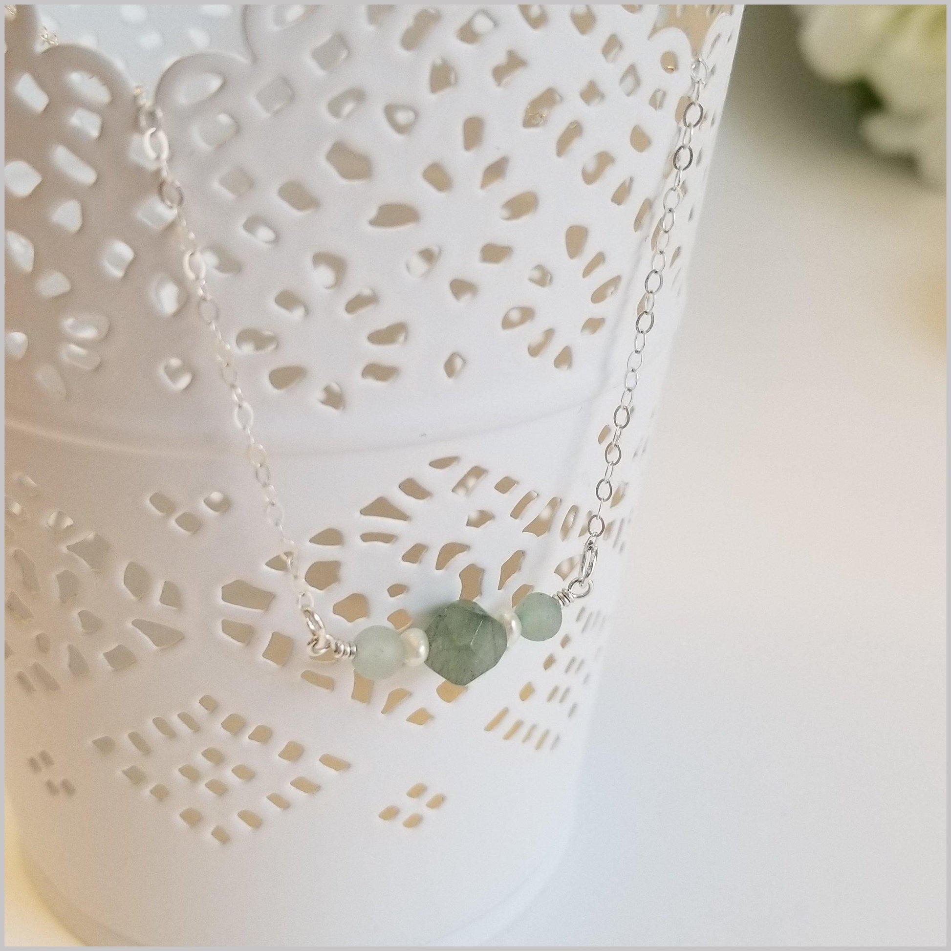 This elegant necklace is handmade with natural Freshwater Pearls and Green Adventurine. Available in 14 K Gold Fill Chain.