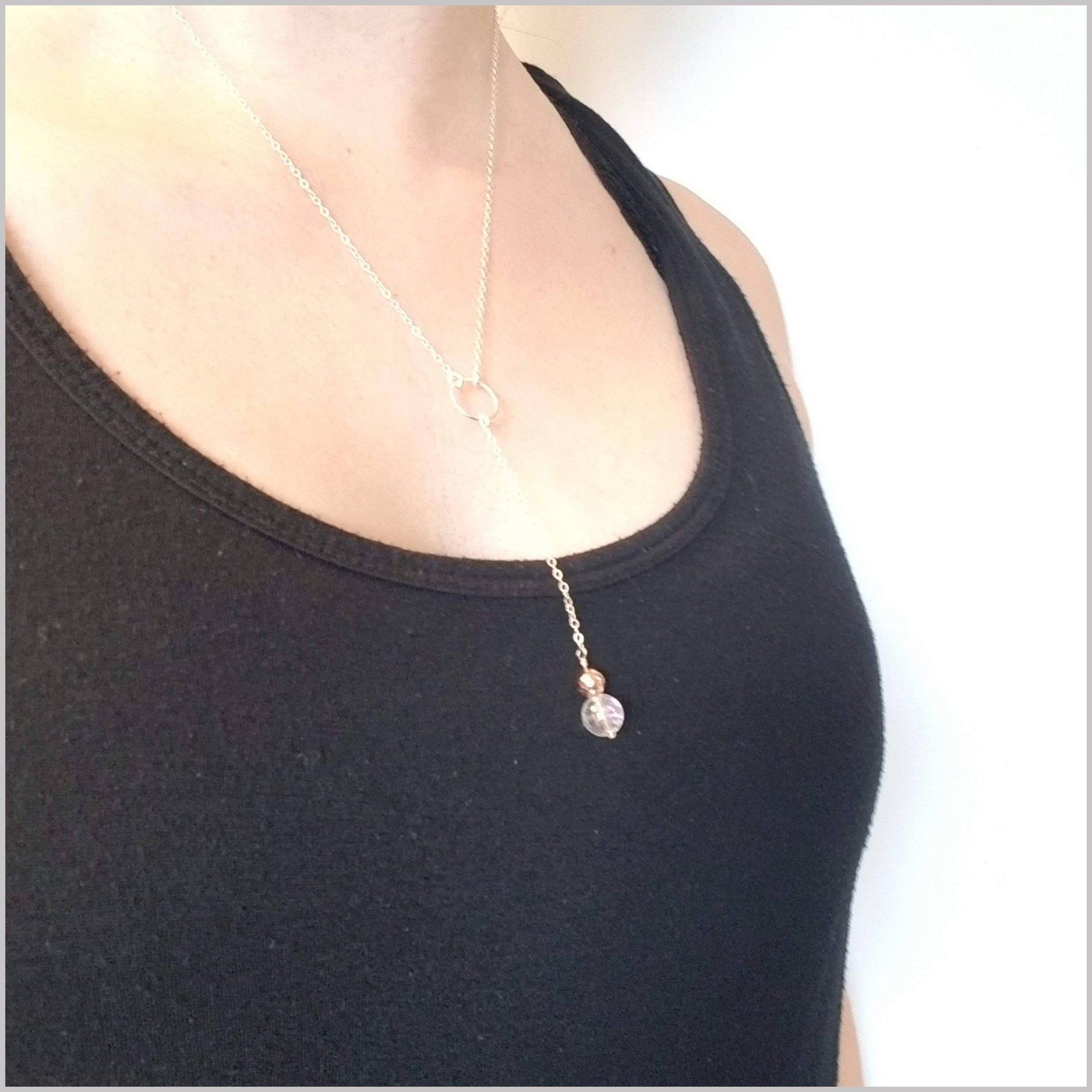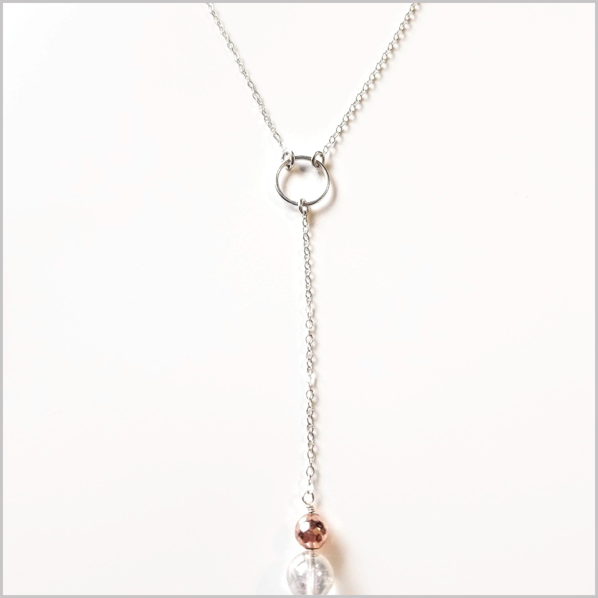 This Delicate stationary Lariat necklace is available in 925 Sterling Silver or 14K Gold Fill and moves as freely as you do. The Crackle Quartz and Hematite are a power duo of healing and protection.