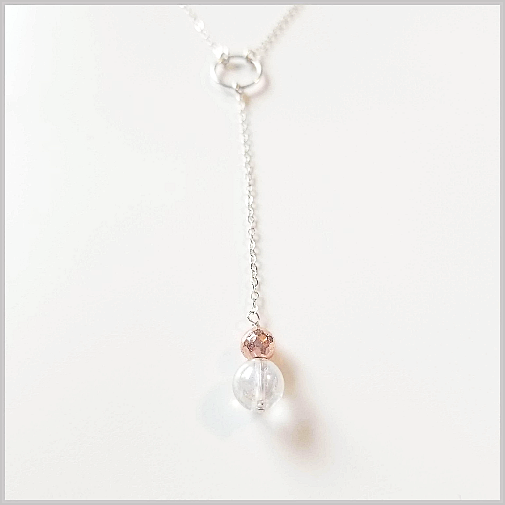 This beautiful and delicate necklace is handmade with natural Clear Quartz and Rose Gold Electroplated Hematite.
