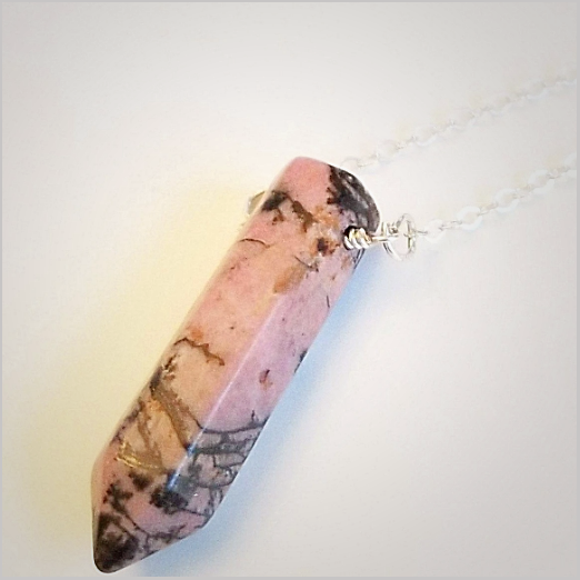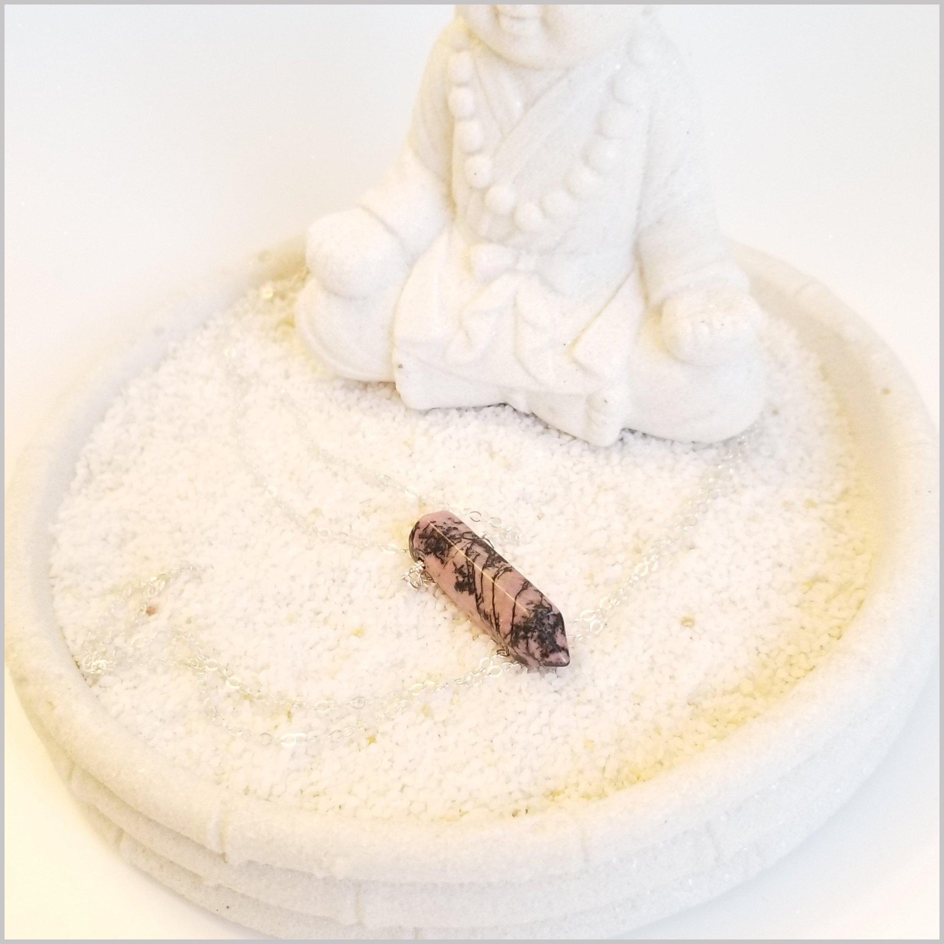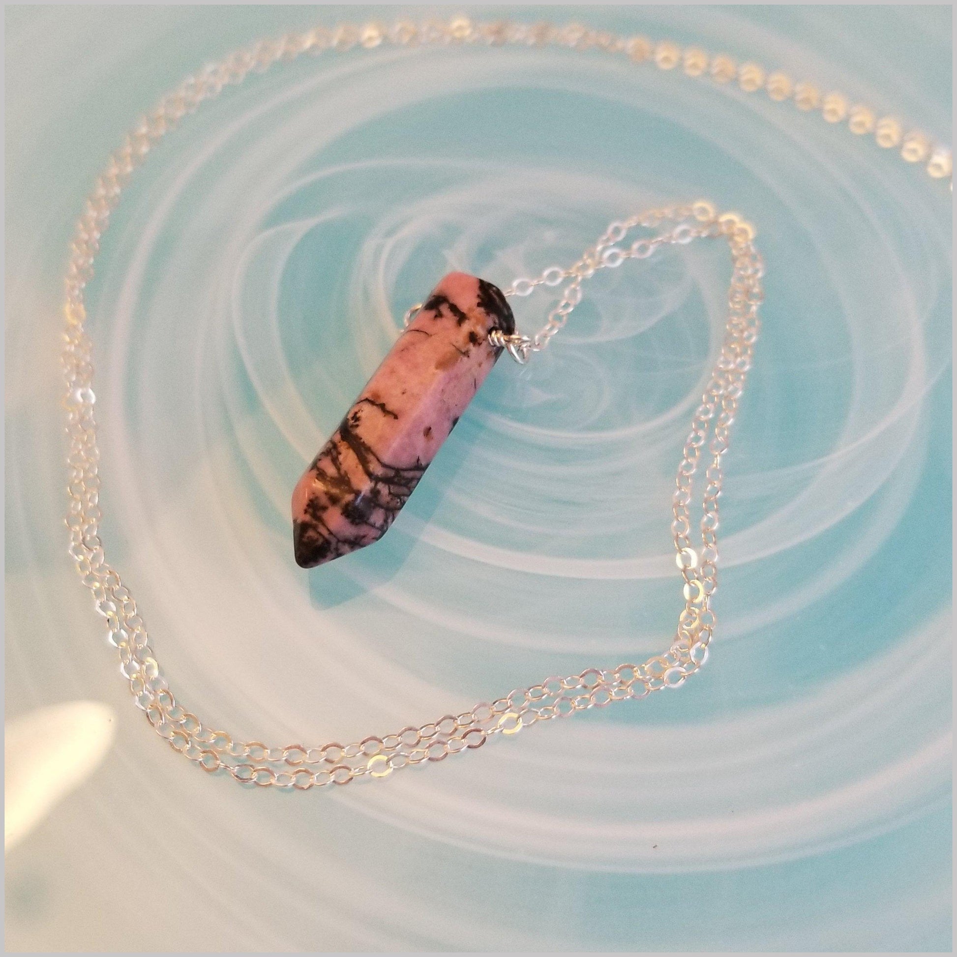 This beautiful and delicate necklace is handmade with natural Rhodonite.